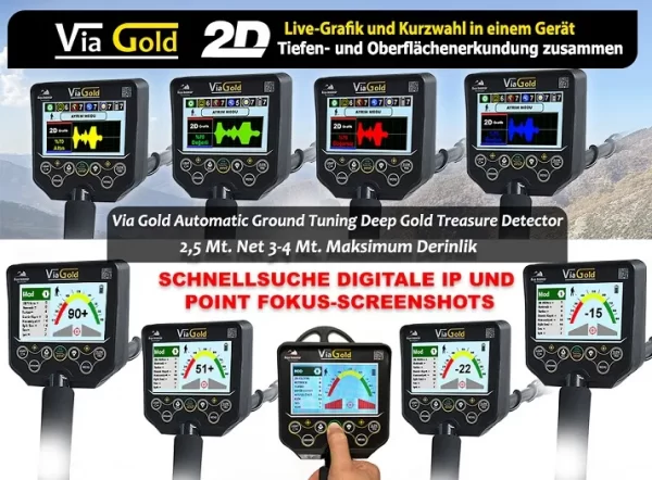 Via Gold Golddetektor kann dank seines Preises und seiner Eigenschaften den tiefsten Schatz und vergrabene Schätze ohne Tiefenverlust in Gestein und Boden finden und Gold, Silber, Bronze, bronzeartige Metalle, sowie Statuen, Barren, einzelne Münzen, tief vergrabene Schätze und unterirdische Kammergräber und Tunnel garantiert in einer Tiefe zwischen 30 cm und 2,5 Metern zu finden. Via Gold-Detektor kann Goldobjekte und Schätze dank seiner 2D-Live-Grafikeigenschaft und spezieller Software und Design auf der Zahlenwertanzeige mit einer Garantie um 70% unterscheiden. Via Gold-Detektor kann wertlose Metalle um 70% unterscheiden.